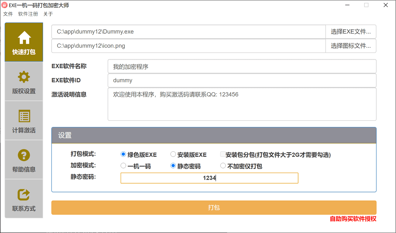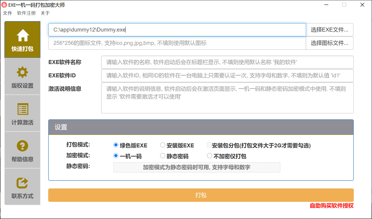 不加密仅打包: 不加密仅打包模式处理后的EXE文件,可以直接运行,不需要输入激活码,静态密码