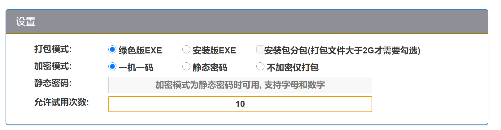 一机一码加密模式下,支持设置允许试用次数,设置的范围为0-1000,设置后,加密生成的EXE可以在没有激活码的情况下试用一定次数